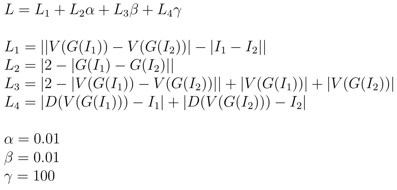 Here, the purpose of L_1 term is to make sure that distances in visual latent space are roughly the same as distances in word embeddings space. L_2 keeps images generated by G as far apart as possible in RBG space. L_3 keeps images generated by G as far apart as possible in visual space while keeping its mean at 0. L_4, the most important term, makes sure that reconstructed word embeddings are the same as initial ones. Values for α, β, γ are found empirically.