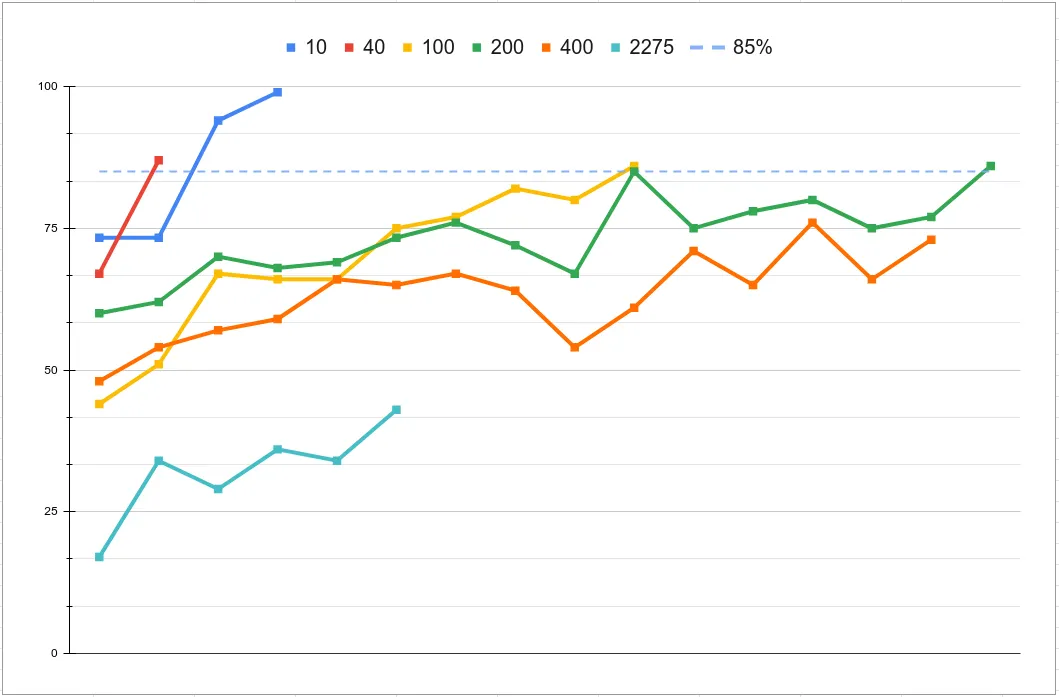 Here is how a two-week learning progress looked like for different dictionary sizes: