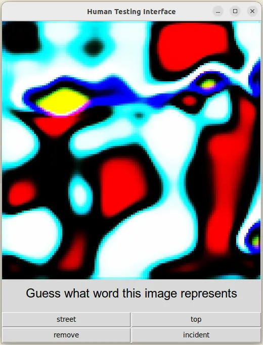 To test if our methods are doing well we are going to use the reconstruction rate metric. To calculate the metric, we need to collect 2265 most common English words and expand this list with 10 digits. A random word gets converted to its embedding with the universal sentence encoder and passed to the generator that generates the image representing the word. Then, depending on who is the test subject (human or machine) we use one of the following: